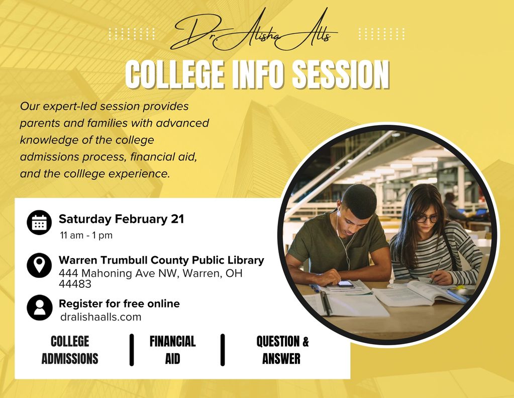It's time to register for Dr. Alisha Alls' Free College Info Session! Discussing college admissions and financial aid. Complete the form today using this link: https://forms.gle/EcsTfJGH2SRKoDnc6